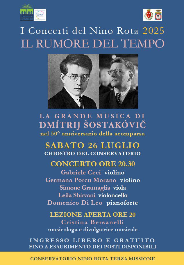 A tribute concert dedicated to Dmitrij Šostakovič on the 50th anniversary of his death, featuring Gabriele Ceci, Germana Porcu Morano, Simone Gramaglia, Leila Shirvani, and Domenico Di Leo. Includes an introductory lecture by musicologist Cristina Bersanelli.